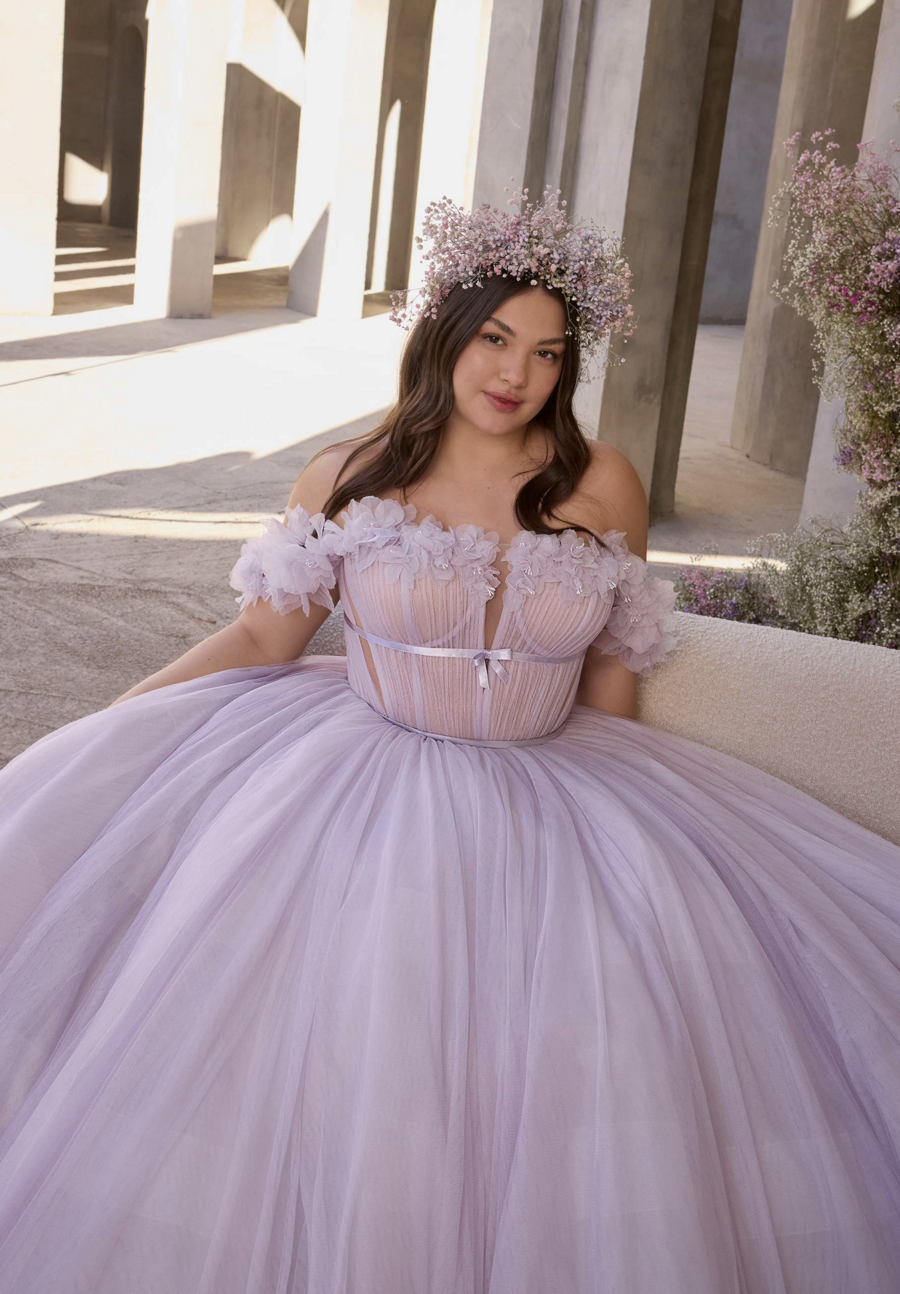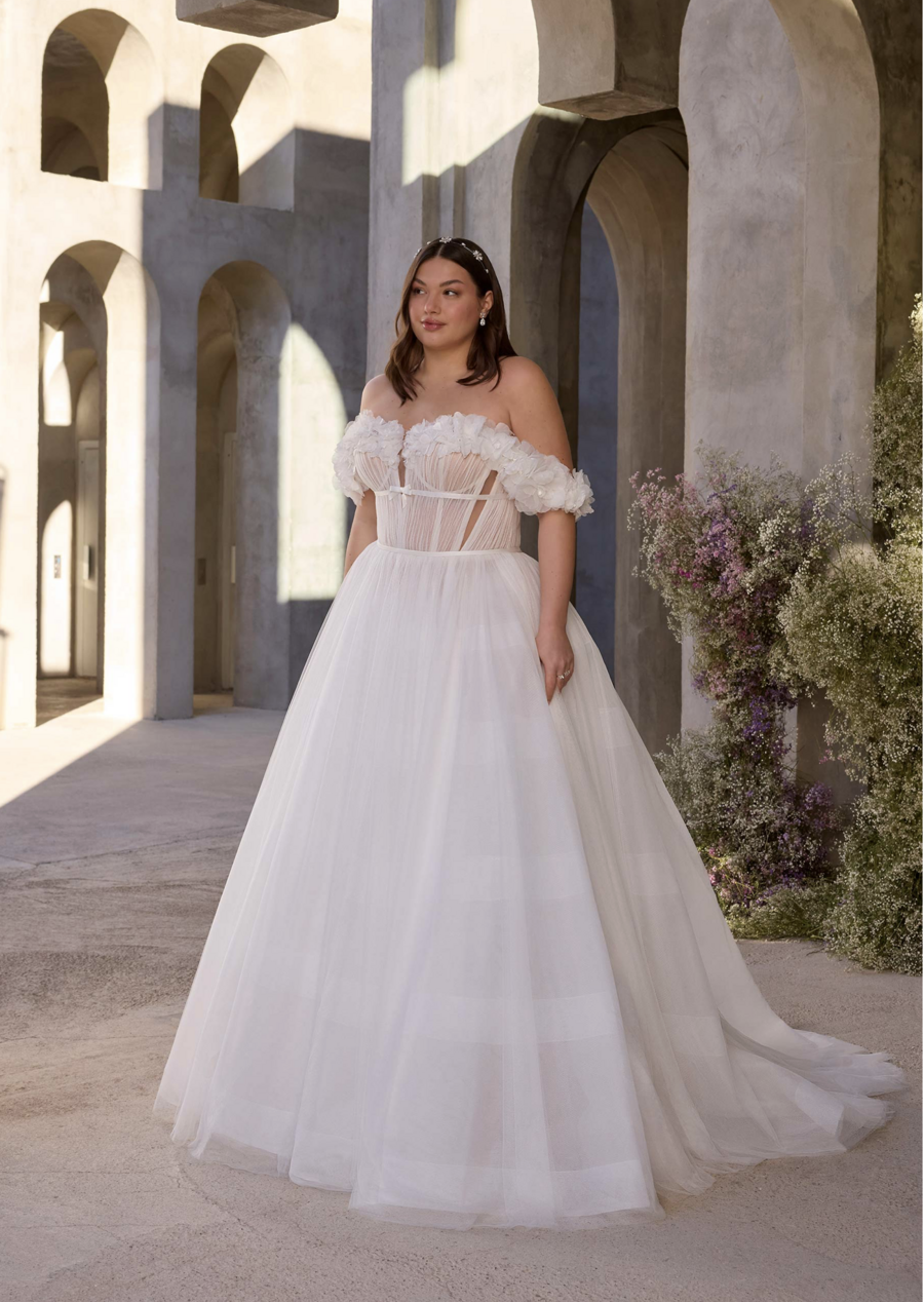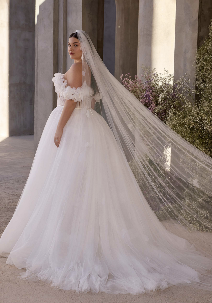 A-line wedding dress in gathered tulle and organza has an plunging neckline, 3D floral off-the-shoulder sleeves and a satin bow.