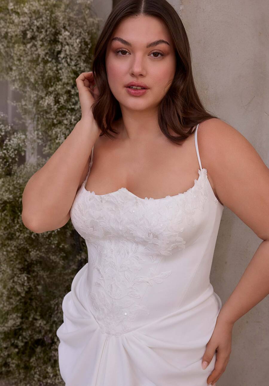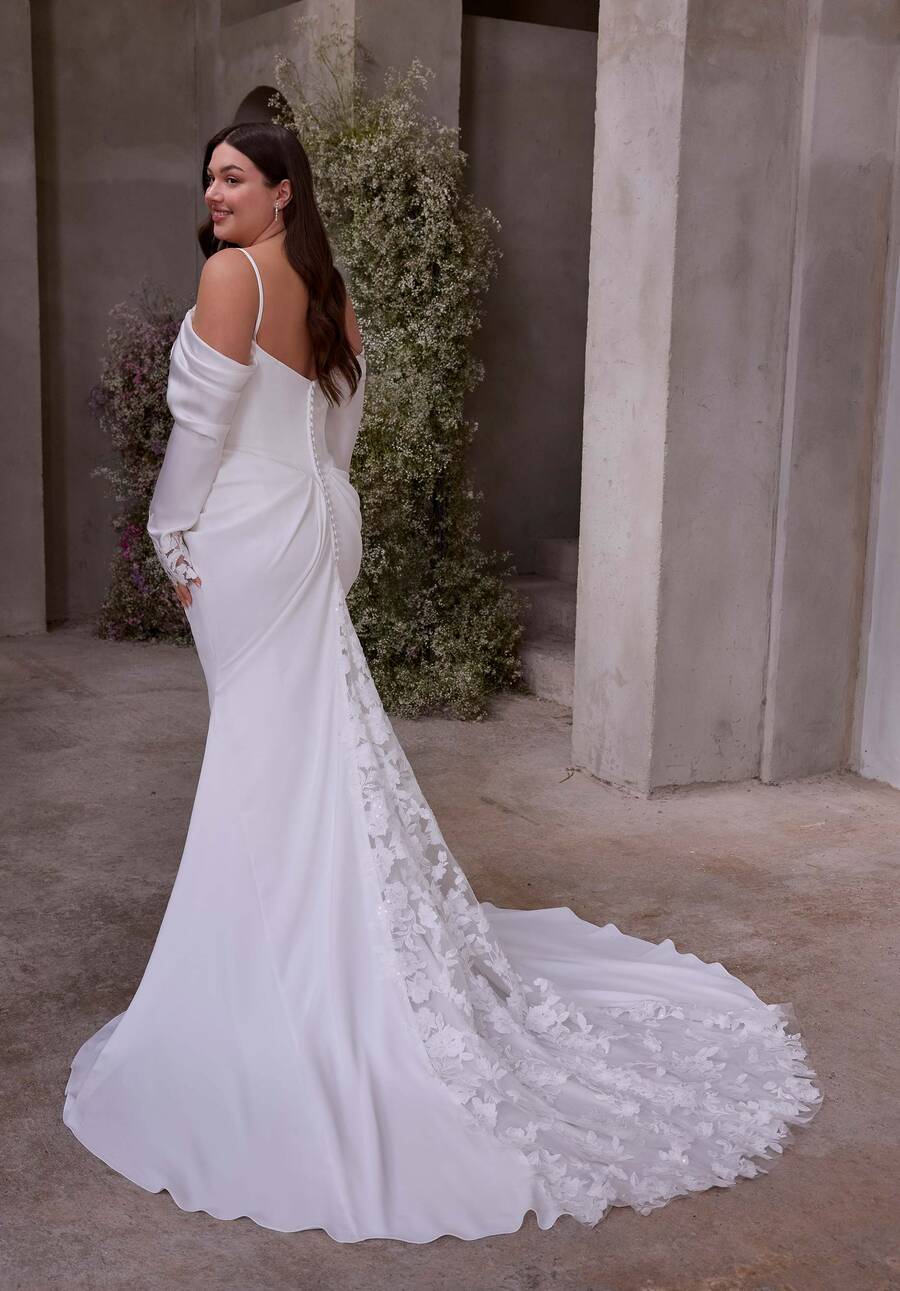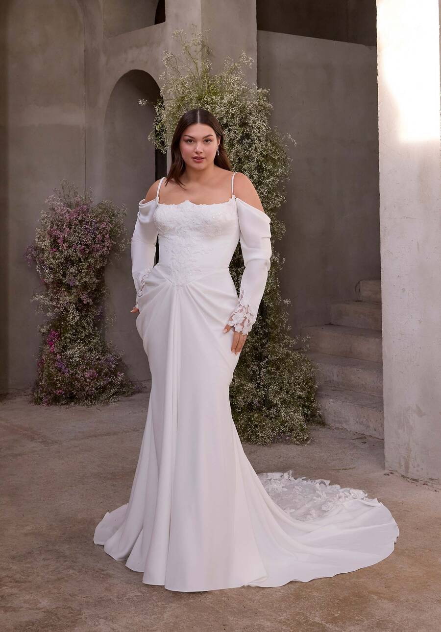 Valeria // Crepe fit and flare wedding dress has an angel wing neckline, thin straps with detachable long sleeves, and a draped basque waist with beaded embroidery and lace train.